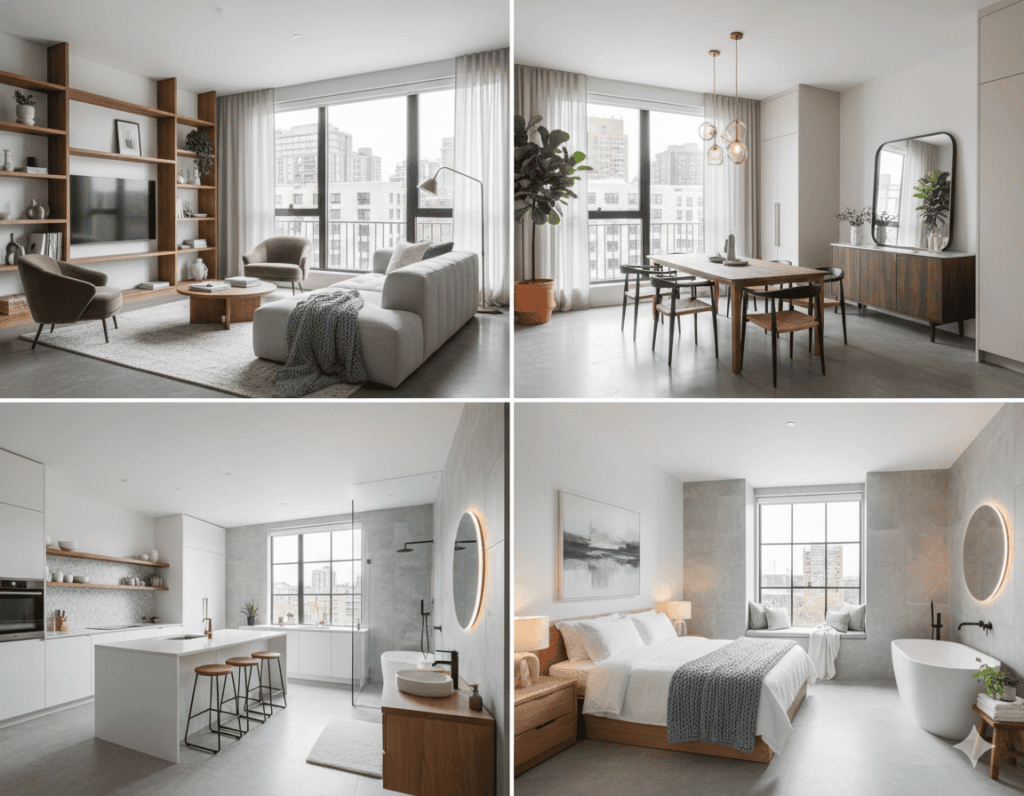 Utilizamos una paleta de colores estudiada, soluciones de almacenamiento integradas que desaparecen en la arquitectura y un diseño de mobiliario de líneas puras para crear hogares urbanos que se sienten espaciosos, ordenados y llenos de calma.